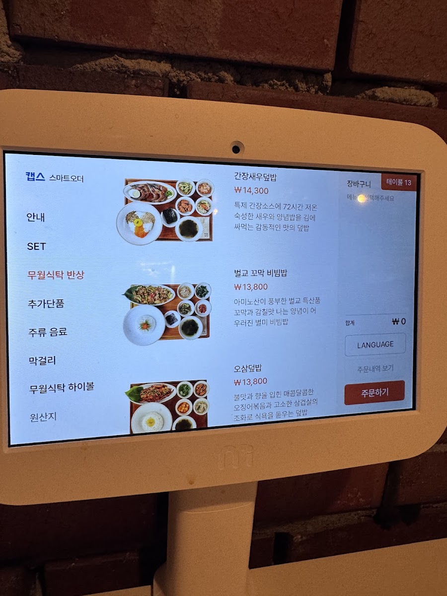 Highlights include dishes like 한방바베큐보쌈과 곤드레비빔밥 (herbal barbecue pork belly with wild greens bibimbap), 낙지덮밥 (octopus rice bowl), and 벌교꼬막비빔밥 (clam bibimbap), offering a variety of rich, layered flavors that pair well with the inviting, warm atmosphere. The set meals, such as 보쌈정식 (boiled pork set) and 새우장정식 (soy-marinated shrimp set), provide a well-rounded dining experience that feels both wholesome and satisfying.